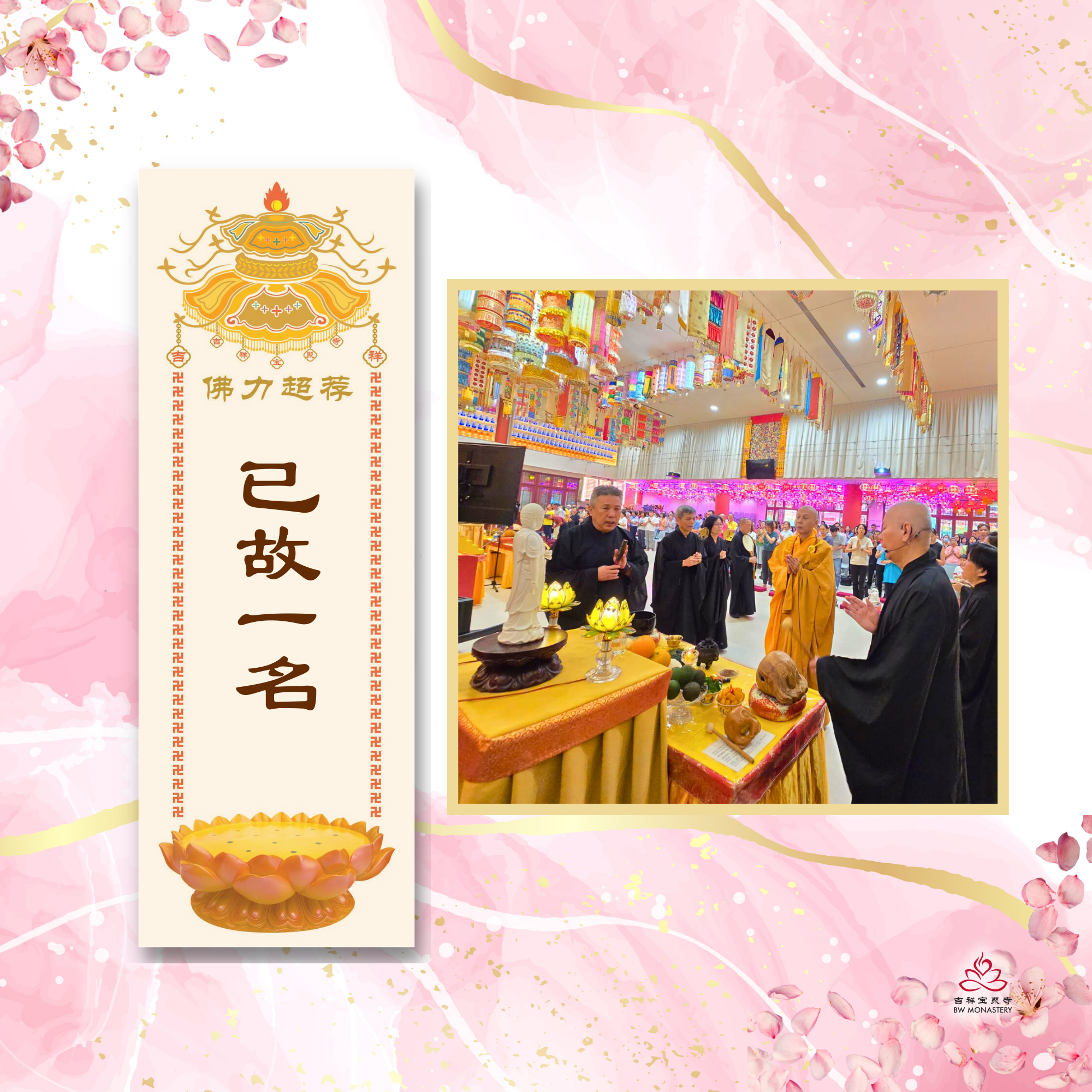 💫 施主作何功德:捐资供养寺院弘法利生,以此功德回向往生者。💫 寺院赠与项目:🌸 寺院为往生者安立超荐牌位,祈求佛力加持。🌸 观音诞法会功德回向:往生者业障消除,出离苦海,速得阿弥陀佛慈光摄受,往生极乐世界,修学正法,成就佛道。